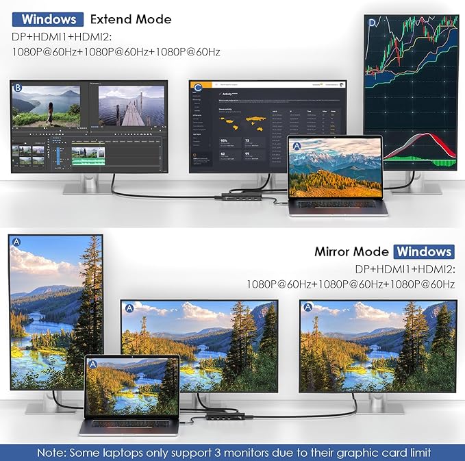 - Triple Display USB C Dock: This USB-C Docking Station has three high-definition video output ports, Dual HDMI and one DisplayPort. Only the Windows system supports the Triple display ( MST), Mac OS is not supported