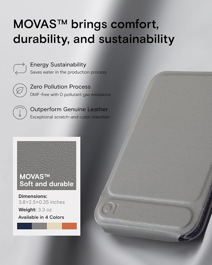 - 3-in-1 & Eco-friendly: This everyday carry features a phone tripod, phone stand and magsafe wallet with a simple fold to transform. It folds into an 8" phone tripod stand in a second. Crafted with the pioneering water-based MOVAS Vegan Leather, it's smooth to the touch while saving water from the manufacturing process.