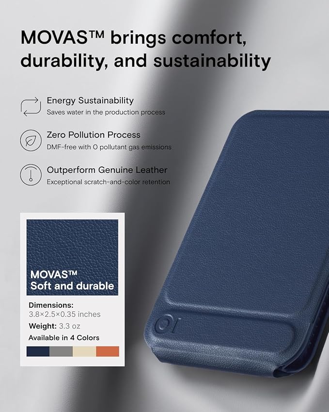 - 3-in-1 & Eco-friendly: This everyday carry features a phone tripod, phone stand and magsafe wallet with a simple fold to transform. It folds into an 8" phone tripod stand in a second. Crafted with the pioneering water-based MOVAS Vegan Leather, it's smooth to the touch while saving water from the manufacturing process.