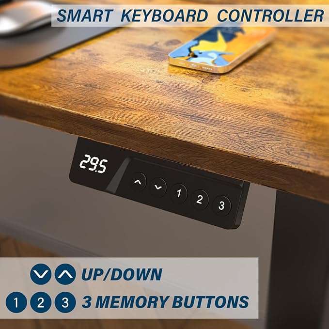 - Smooth Electric Lift Function: The desk features a powerful and quiet electric motor (<45dB). It lifts at 25mm/s, with a height adjustment range of 27.6" - 45.3", accommodating different heights for various needs. The adjustable desk comes with an easy-to-use control panel and memory function, allowing you to preset up to 3 frequently used heights for enhanced efficiency and comfort at work