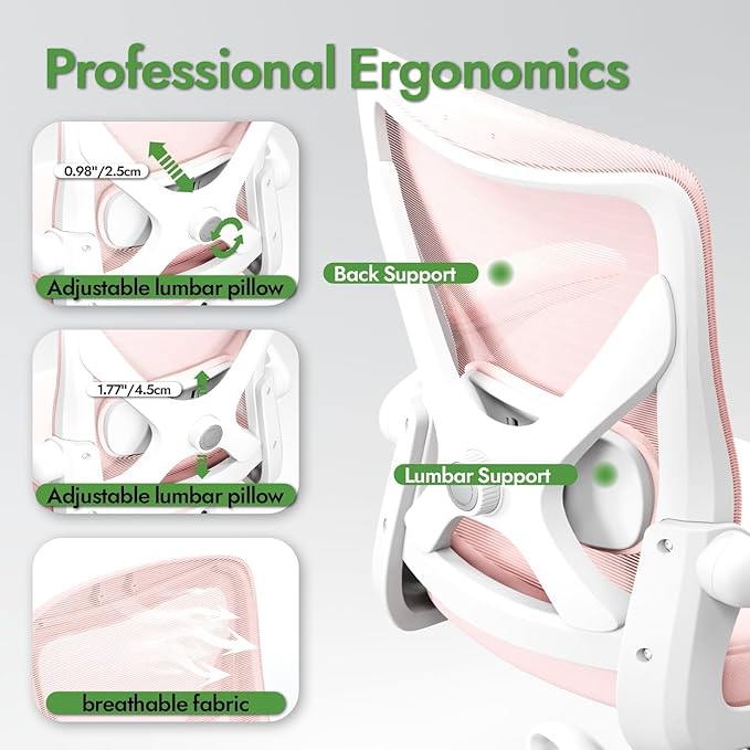 Ergonomic Office Chair: Mesh Desk Chair with Adjustable Lumbar Support 330lbs High Back Computer Gaming Chair - Work Chairs with Flip-Up Arms for Long Hours-Adults Home Office (Pink)