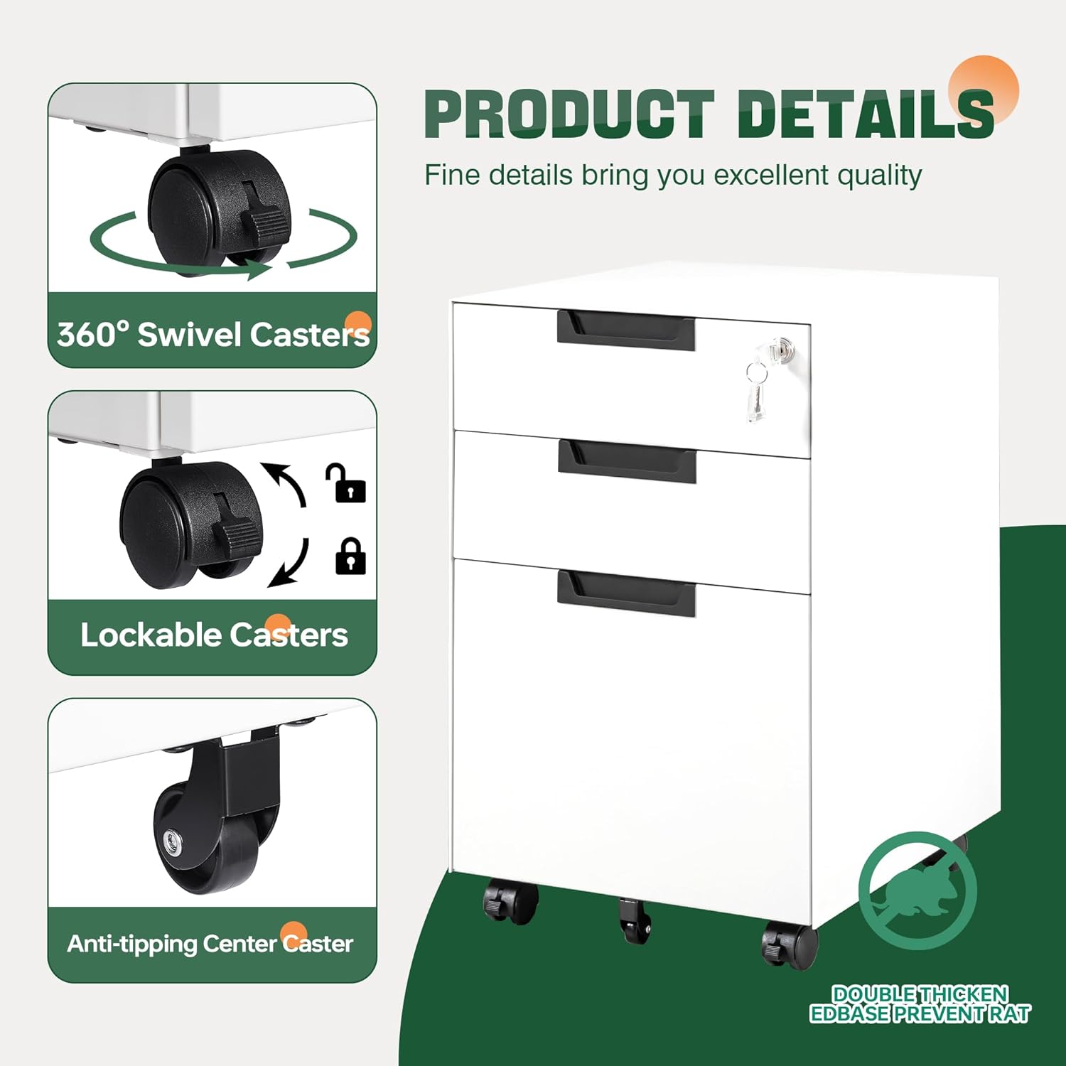 Letaya 3 Drawer Mobile File Cabinet with Lock,Under Desk Metal Small Filing Cabinets for Home Office Organizer Letters/Legal/A4(Fully Assembled Except Wheels-White)