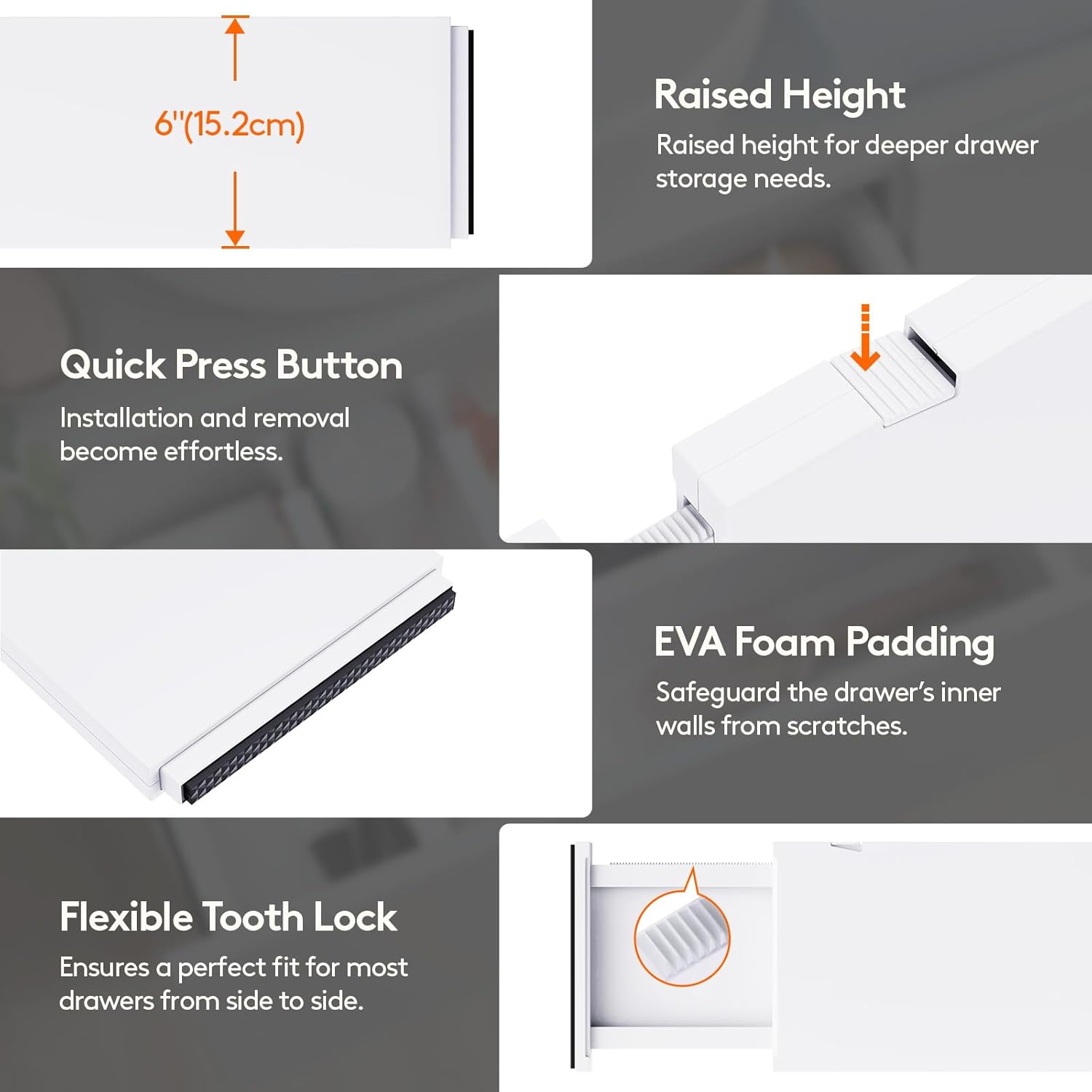 - Sturdy Construction: Made of robust ABS material, our dresser organizer features EVA foam sponges on the ends to prevent scratches and damage to your drawer’s interior, ensuring a clean and stable fit without residue; Our divider is patented (Patent No: US12133593B2)