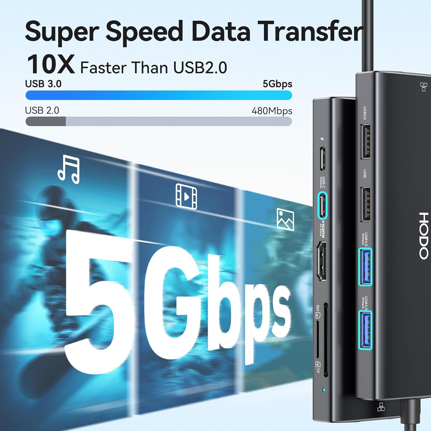 - USB C Hub Multiport Adapter 10 IN 1: With this usb c dock, you can easily fulfill your daily use by extending one USB C port to 4K HDMI, Gigabit Ethernet, 3*USB 3.0 ports, 2*USB 2.0 ports, USB C Power Charging Port (max 100W), USB C data transfer port(5Gbps), TF/Micro SD card reader. Compatible with MacBook, Dell, HP, Surface, Lenovo, ASUS, etc.