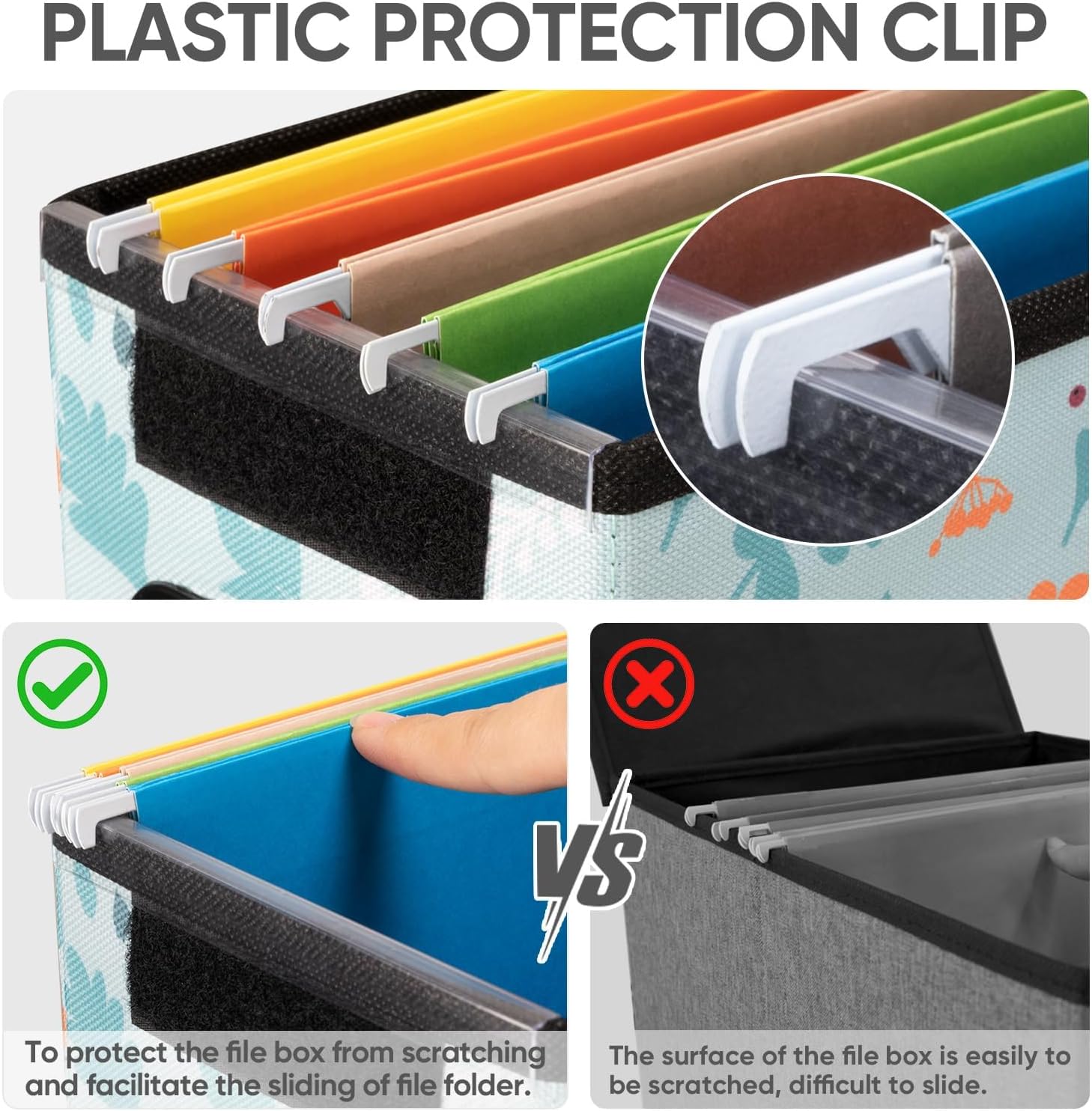 - [UNIVERSAL SIZE] Our file box with lid fits letter-sized files. It is designed for efficiency and functionality, with its smooth PVC slide rails on both sides, you can effortlessly slide file folders for easy access and neatly arranged. The lid fits snugly on the box after hanging folders. (NOTE: file folders are not included)