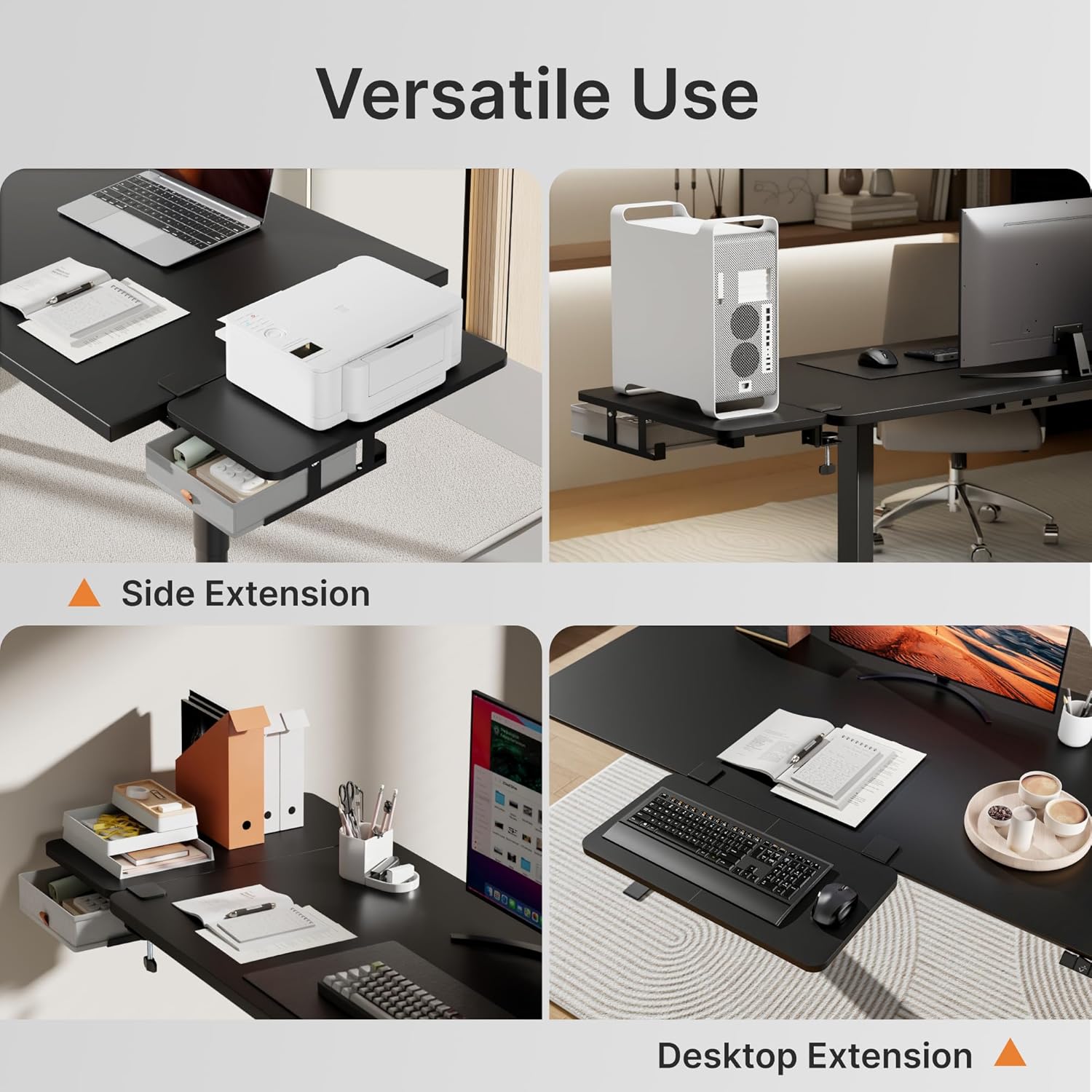 - VERSATILE DESK EXTENDER FOR EXPANDED WORKSPACE: This multi-functional desk extender acts as a clamp-on desk shelf or a keyboard tray, providing additional workspace and support. It extends your desk surface, provides arm support to reduce fatigue, and improves overall comfort, making it ideal for both work and play.