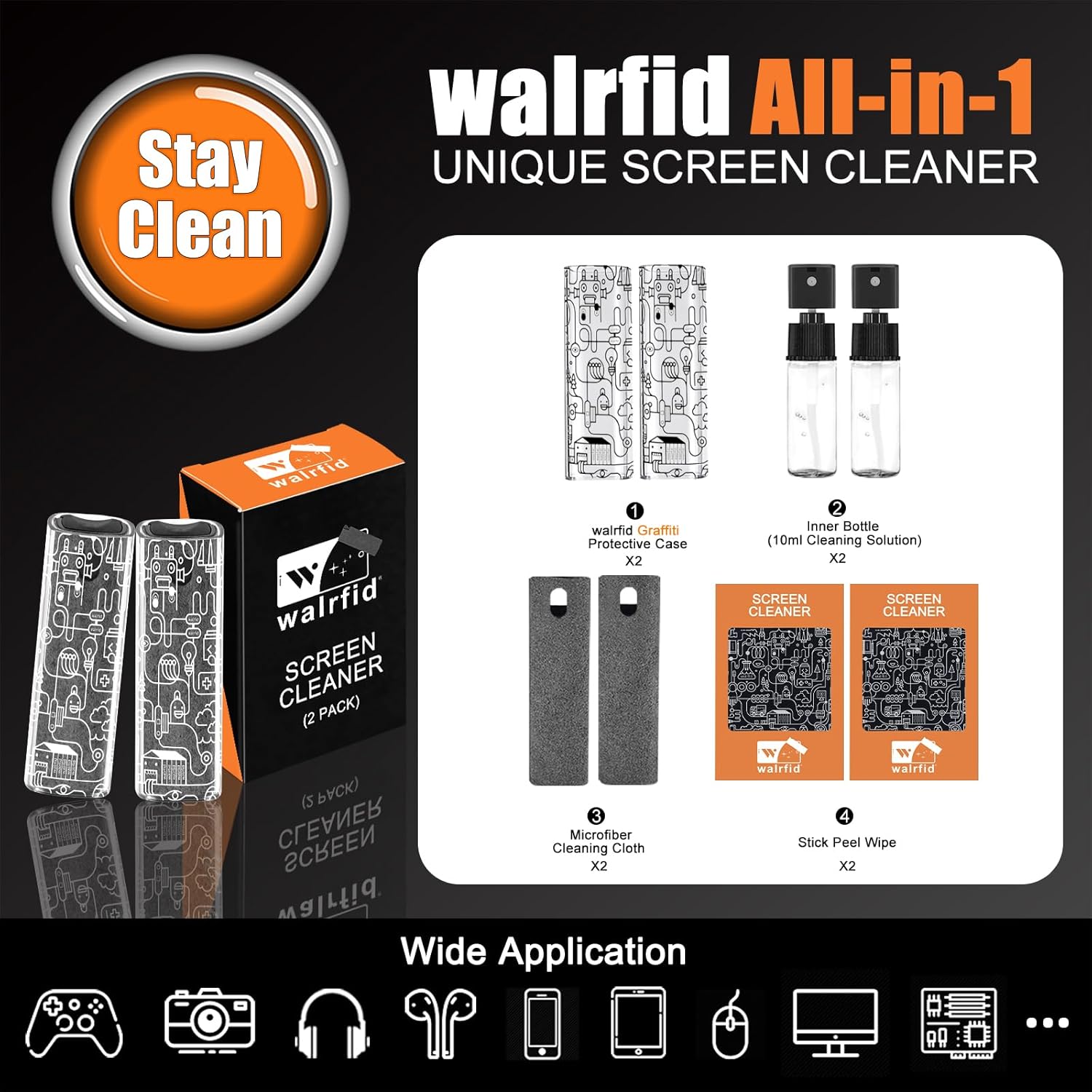- 2 in 1 Screen Cleaner Kit: All-in-One screen cleaner spray and wipe tool, including 2 Pack 10ml built-in screen cleaner spray, square phone cleaner sticker, microfiber cleaning cloth, graffiti protective case, and storage box. walrfid graffiti macbook cleaning kit effectively removes smudges, fingerprints, dust, and dirt, ensuring that your electronic screen remains clear for optimal visibility without scratching.