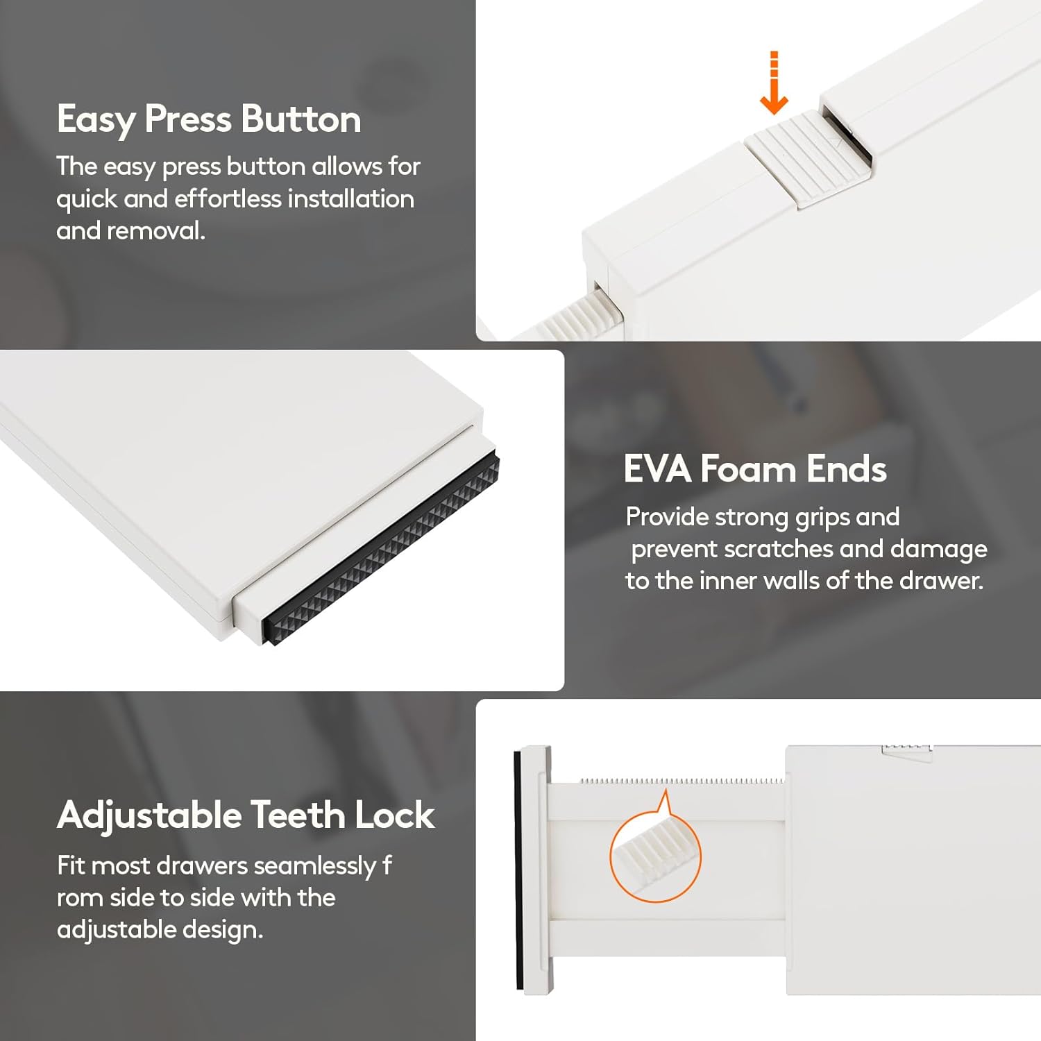 - Easy to Install: Press the top button and stretch to the desired length, then fully extend again to secure in place; The strong spring tension keeps each drawer organizer securely upright; To retract, press the top button and push the stretched side