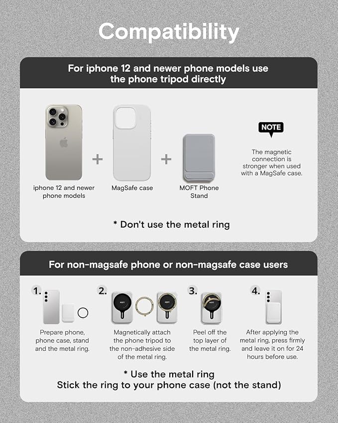 - Universal Compatibility: MOFT Phone Tripod fits iPhone 16/15/14/13/12 series and MagSafe cases. For other devices (such as Samsung) and non-magnetic cases, the phone stand can be attached using the included magnetic ring. Please check the product dimensions (3.8in X 2.5in X 0.27in) to ensure it fits the back of your phone without obstructing the camera. The slim design ensures your phone’s lenses stay unobstructed-perfect for Instagram-worthy shots at cafes, parks, or business events.