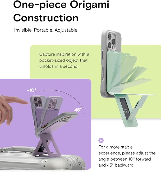- Flexible Angles: Adjust the magnetic hinge for the perfect angle. Whether you’re filming a cooking tutorial, taking flat-lay product shots, or video-calling. Angle it for the best landscape time-lapse. Whether you're a travel vlogger, remote worker, or casual photographer, the MOFT Phone Tripod adapts to your lifestyle. Stable, portable, and stylish—it’s the perfect companion for business trips, vacations, and daily creativity!