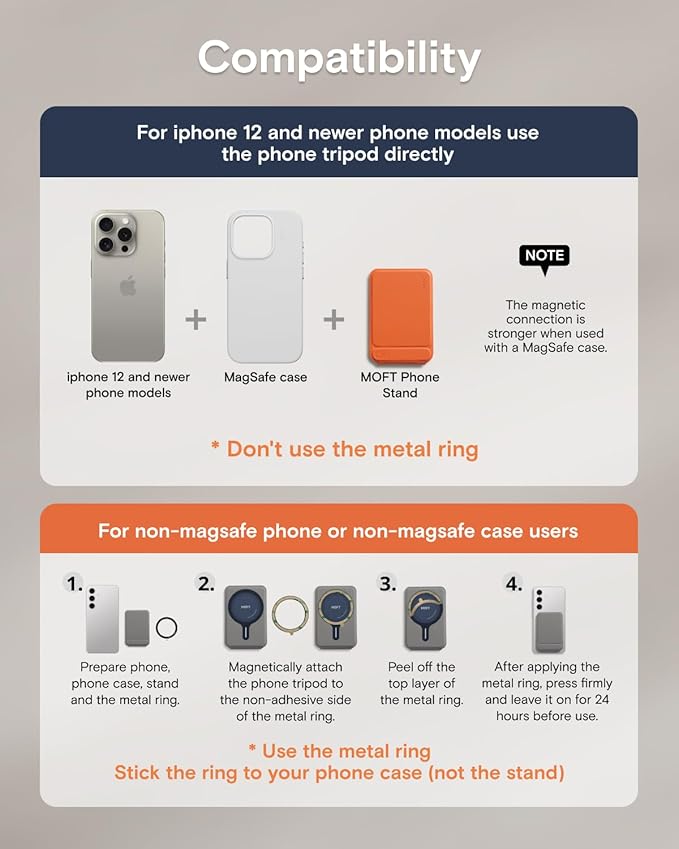 - Universal Compatibility: MOFT Phone Wallet is compatible with iPhone 16/15/14/13/12 series and MagSafe cases. For other devices (such as Samsung) and non-magnetic cases, the phone stand can be attached using the included magnetic ring. Please check the product dimensions (3.8in X 2.5in X 0.35in) to ensure it fits the back of your phone without obstructing the camera. The slim design ensures your phone’s lenses stay unobstructed—perfect for Instagram-worthy shots at cafes or business events.
