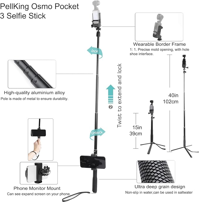 - 【Metal Tripod+Selfie Stick+Expansion Adapter Mount】:the selfie stick and tripod can use alone,and they can be combined for use,up to 1 meter in height,as a ground support filming mount