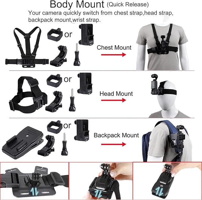 - 【Quick Realease Body Mount】This accessories kit with quick release design, which can be disassembled in even one second. It is very convenient to switch between backpack clip,headband and chest strap mount without having to turn screws slowly