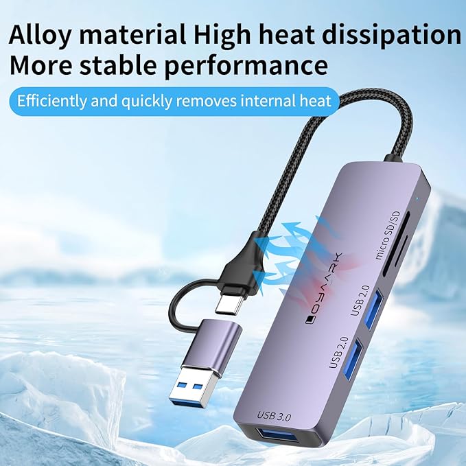- 【5-Port USB 3.0 HUB】USB 3.0 Hub with 5 ports: 1 USB 3.0 port, 2 USB 2.0 ports, SD/TF card reader. You can connect three USB peripherals at the same time, such as keyboard, mouse, printer, and USB stick. The other 2 slots can be used for SD memory cards and micro SD memory cards.
