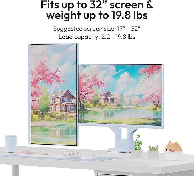 - Dual Monitor Setup - Accommodates two monitors up to 32 inches each and supports up to 19.8 lbs per arm. Each arm has a plate that can support 75x75mm and 100x100mm VESA mounting patterns.
