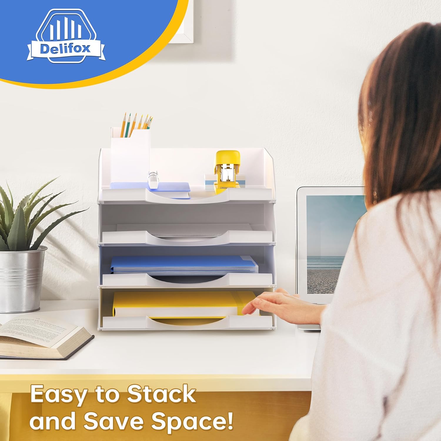 4 Pack Stackable Paper Trays for Letter Documents, Desktop File Organizers for Office Supplies, Stackable Desk Tray Holder for Paper Storage, White