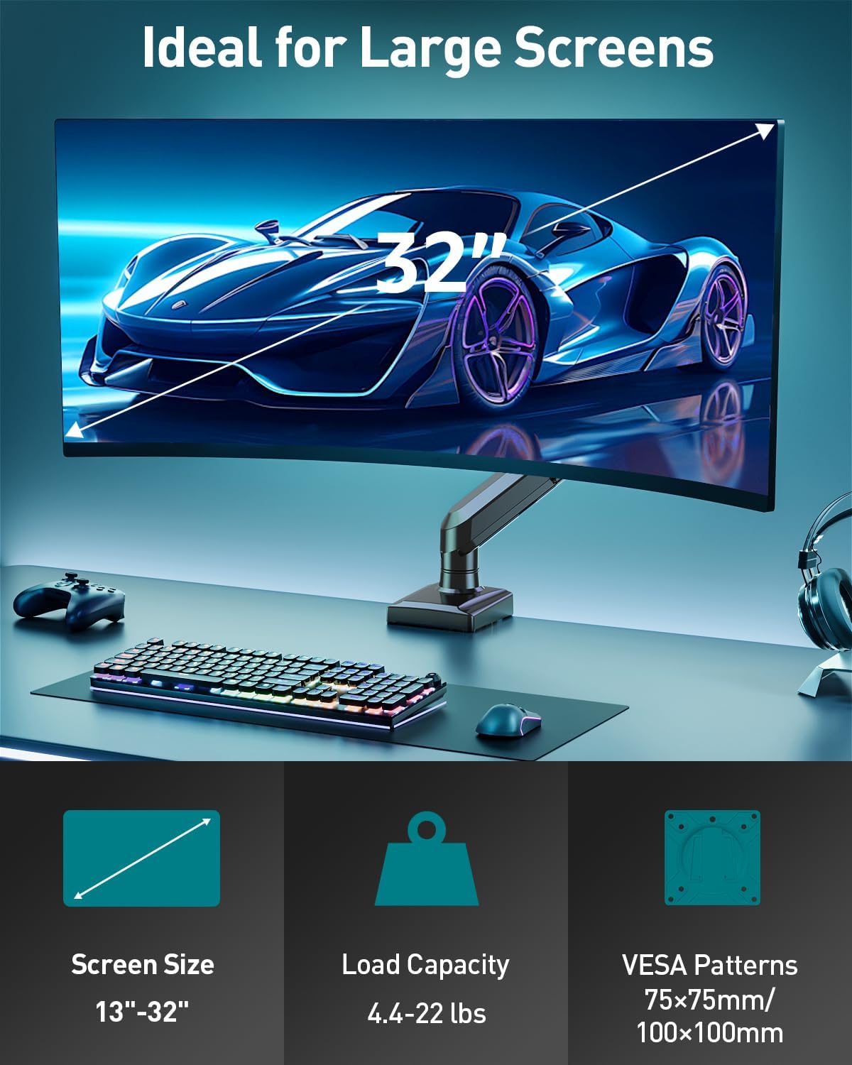 - Universal Monitor Mount: Our single monitor arm perfectly fits most flat or curved LCD/LED screens ranging from 13" to 32", with a max load capacity of 22 lbs, suitable for VESA patterns of 75x75mm & 100x100mm. Compatible with ASUS, Acer, Samsung, LG, AOC, Dell, etc., not limited to 32 30 28 27 25 24 23 22 21 20 19 17 inch screen, but not compatible with 1000R/1500R/1800R curved screens.