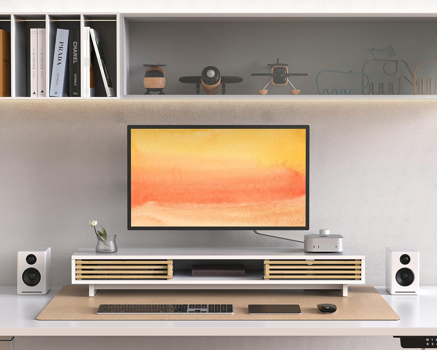 Dual Monitor Stand Riser with Sliding Door, Double Computer Laptop Stand Desk Shelf Organizer with Storage (White + Natural Bamboo, 38 Inch)