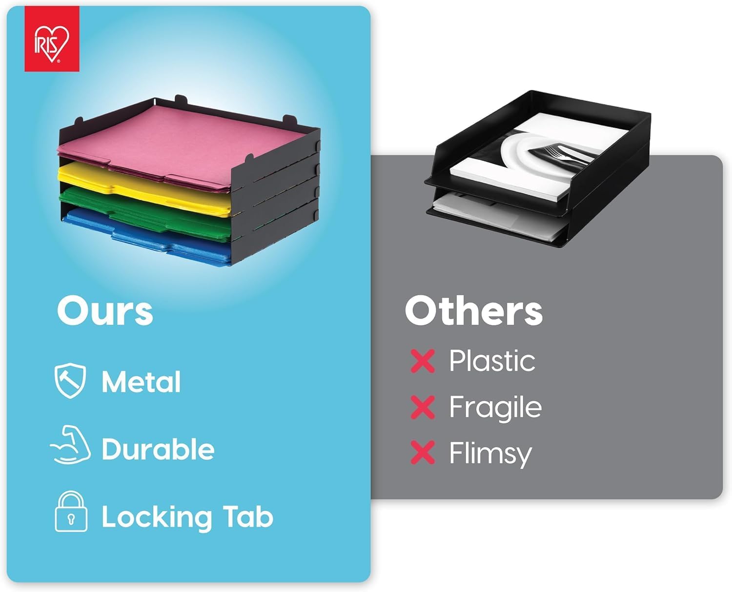 IRIS USA Metal Letter Tray Paper Organizer, 4 Pack, for Letter/A4 File Holder Paperwork Document, Stackable Desktop File Organizer Tray Paper Basket Rack for Office Supplies Home Work, Black