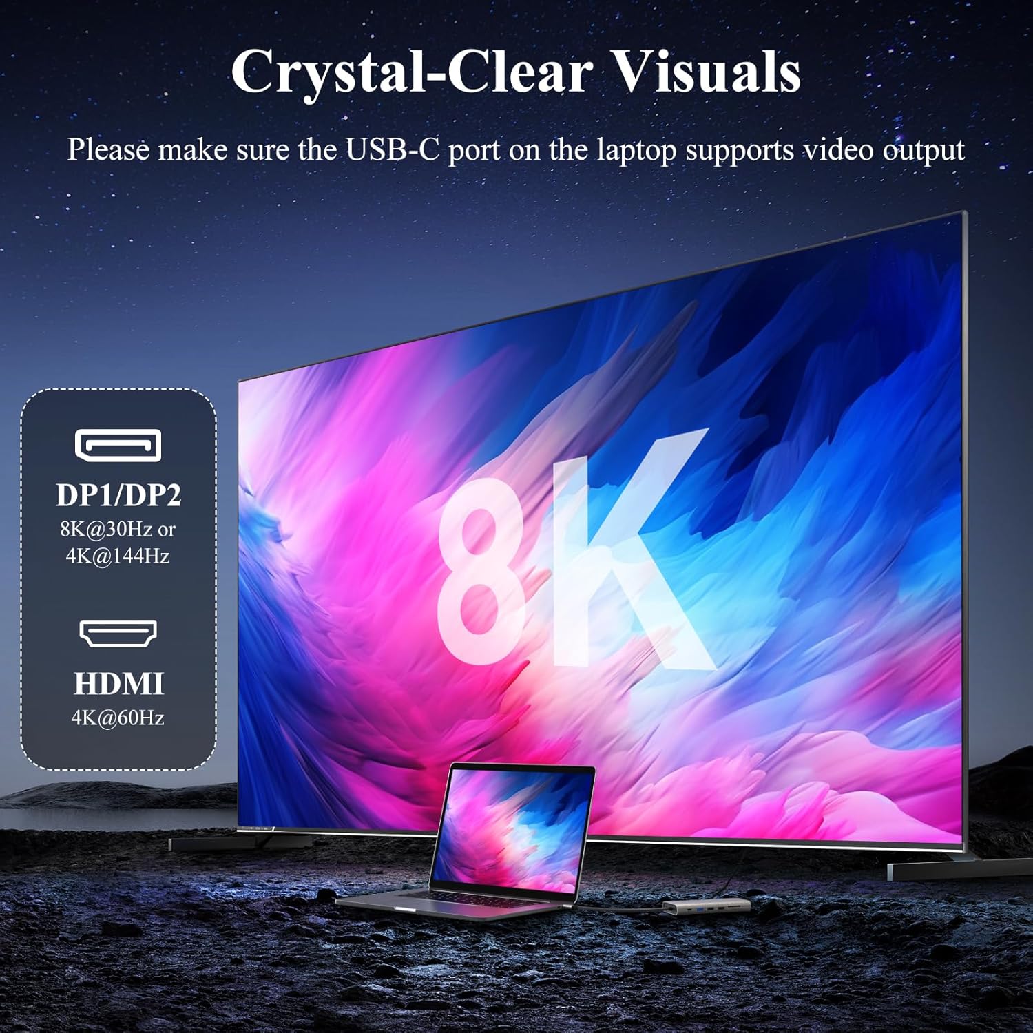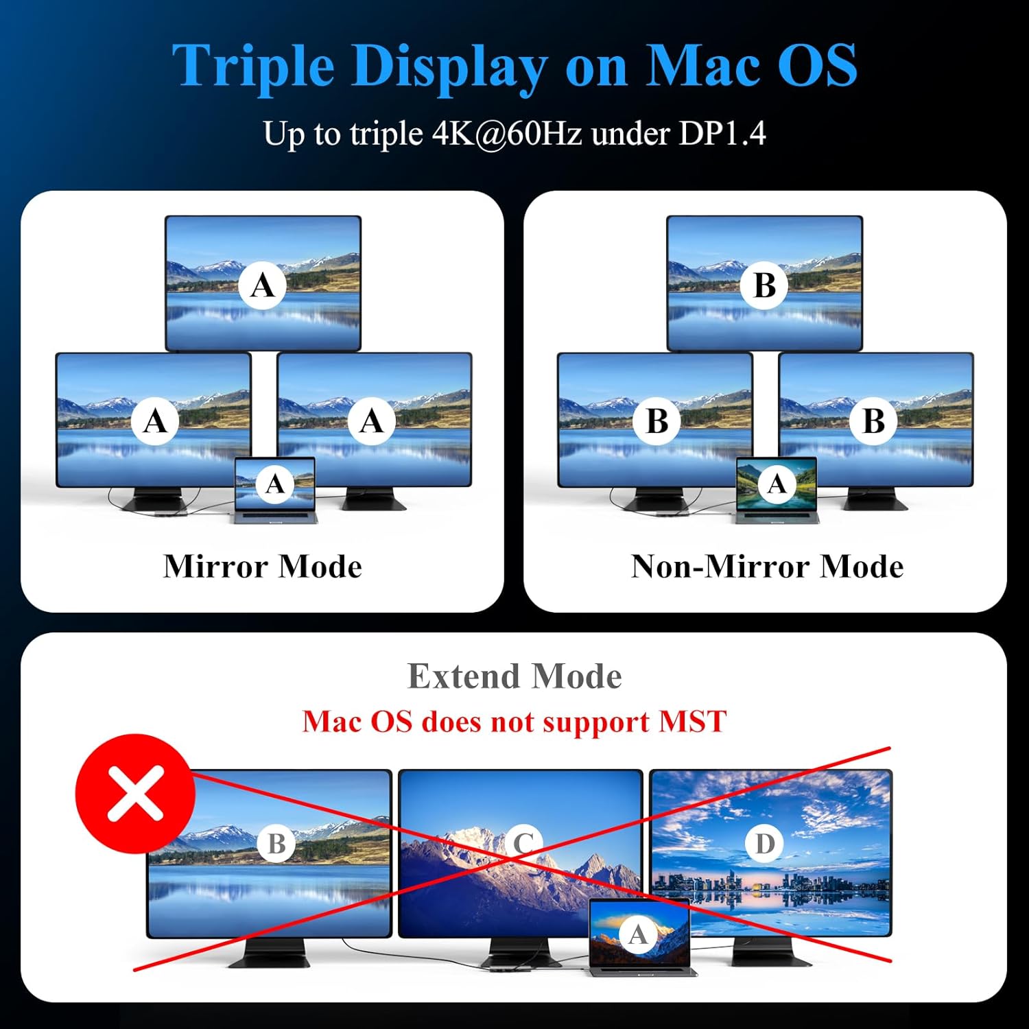 - ★ Docking Station 3 Monitors: Laptop Docking Station DP*2 8K 144HZ & HDMI 4K 60HZ, docking station dual monitor dual monitor for visual creators and gamers, usb c dock delivers ultra HD images with triple 4K (under DP1.4 & DSC1.2) through HDMI and DP1/DP2 ports,Ensure your laptop's USB-C port supports video output. Note: Multi-Stream Transport (MST) is not supported on Mac laptops. Displays connected via HDMI/DP/VGA (if those video ports are available) will mirror the same image