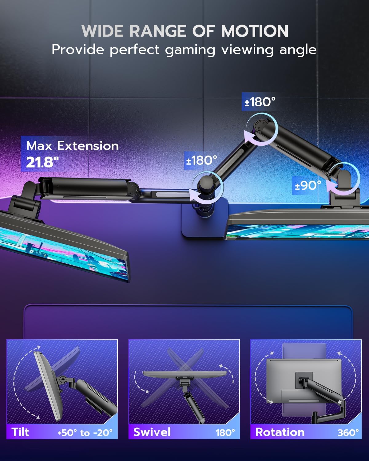 - 【Flexible Adjustment】The dual monitor arms adjust to a maximum height of 28.4 inches, with arms extending 21.8 inches. Featuring a stable premium gas spring and an upgraded head structure, it allows for -50° to +20° tilt, ±90° rotation, and 360° swivel. This monitor dual mount accommodates various screen layouts, optimizing your desktop space and providing an exceptional comfort experience for gaming or viewing.