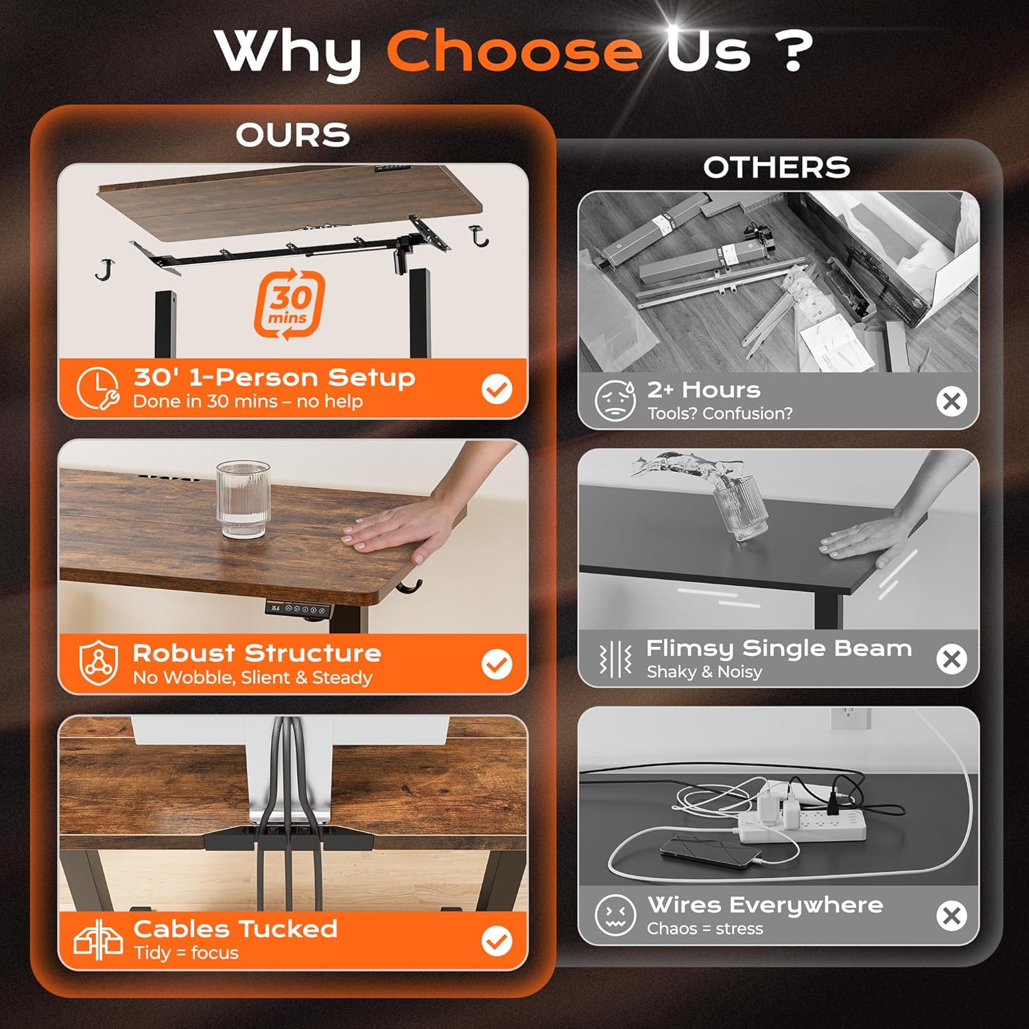 - 【Whisper-Quiet Operation】Powered by a robust yet quiet motor (operating at less than 45 DB), the wide deep desk brings smooth height adjustments without disturbing your household or office environment. This standup desk for home office is ideal for keeping focus and slient
