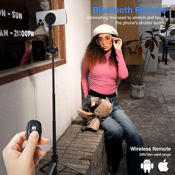 - 【Wide Compatibility】The magnetic selfie stick phone tripod can be directly connected magnetically, for iPhone 16/16 Pro/16 Pro Max, iPhone 15/15 Pro/15 Pro Max, iPhone 14/14 Pro/14 Pro Max, iPhone 13/12 series phones or MagSafe protective cases.