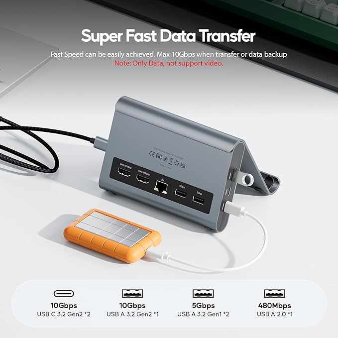 - 【Super Speed Data Transfer Dock】: This surface pro docking station has 2 USB C 10Gbps port (not support video and charging) , 1 *USB A 10Gbps 5Gbps and 2 *USB A 5Gbps to transfer files. The USB A 2.0 Port allows you to connect mouse/keyboard without lag. It improves your work efficiency. With PD 100W Charge Port and RJ45 Wired Gigabit Ethernet (10/100/1000Mbps). 【NOTE】:Do not support using with laptop case for stand function.