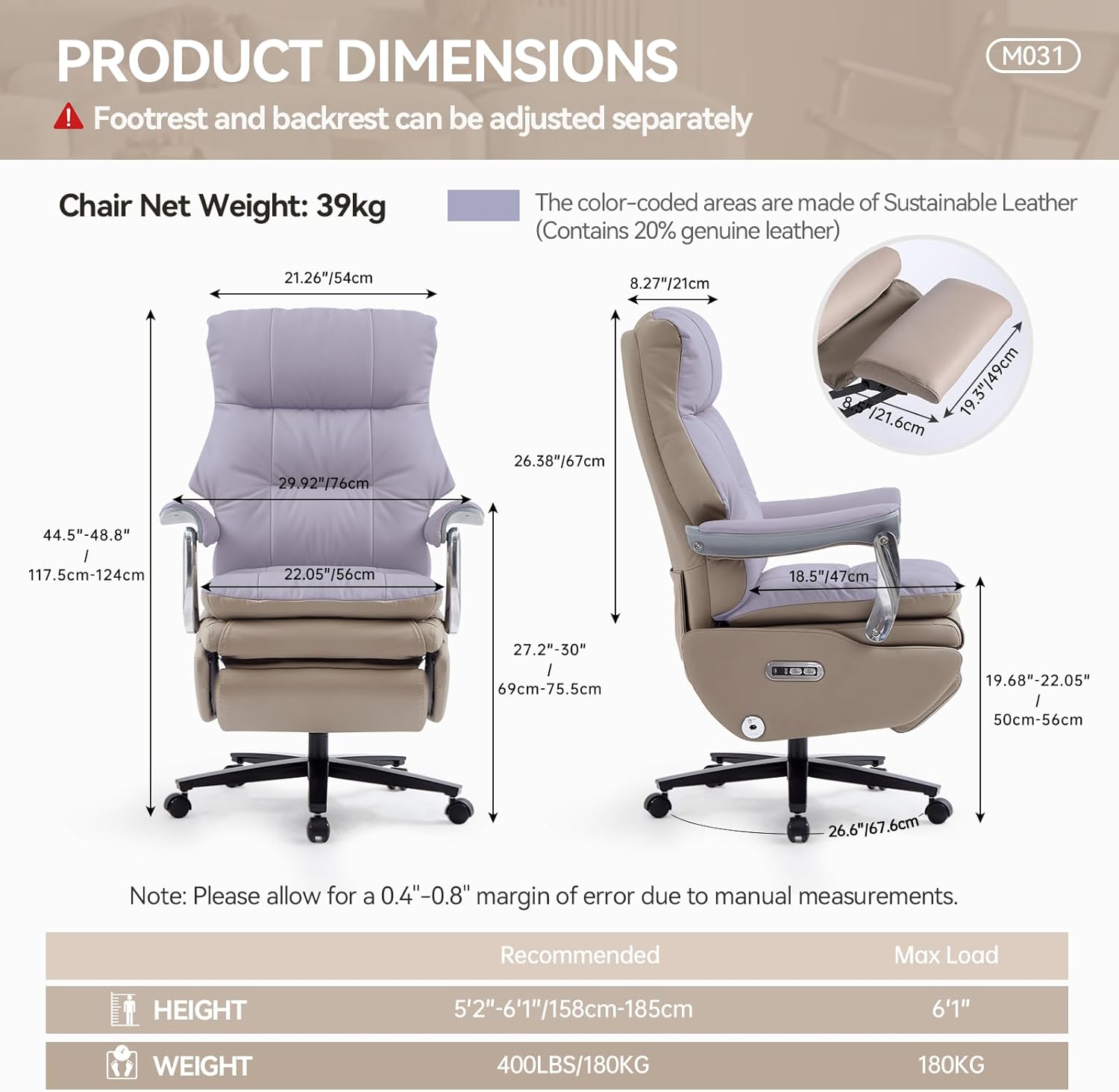 - Dual-Motor Precision Adjustment: This electric office chair uses a dual-motor system for independent backrest and footrest control. With a 160° recline range, lock at the perfect angle for work or rest. Ideal as an ergonomic office chair for tasks or a comfy reclining office chair for breaks, it fits all seating needs