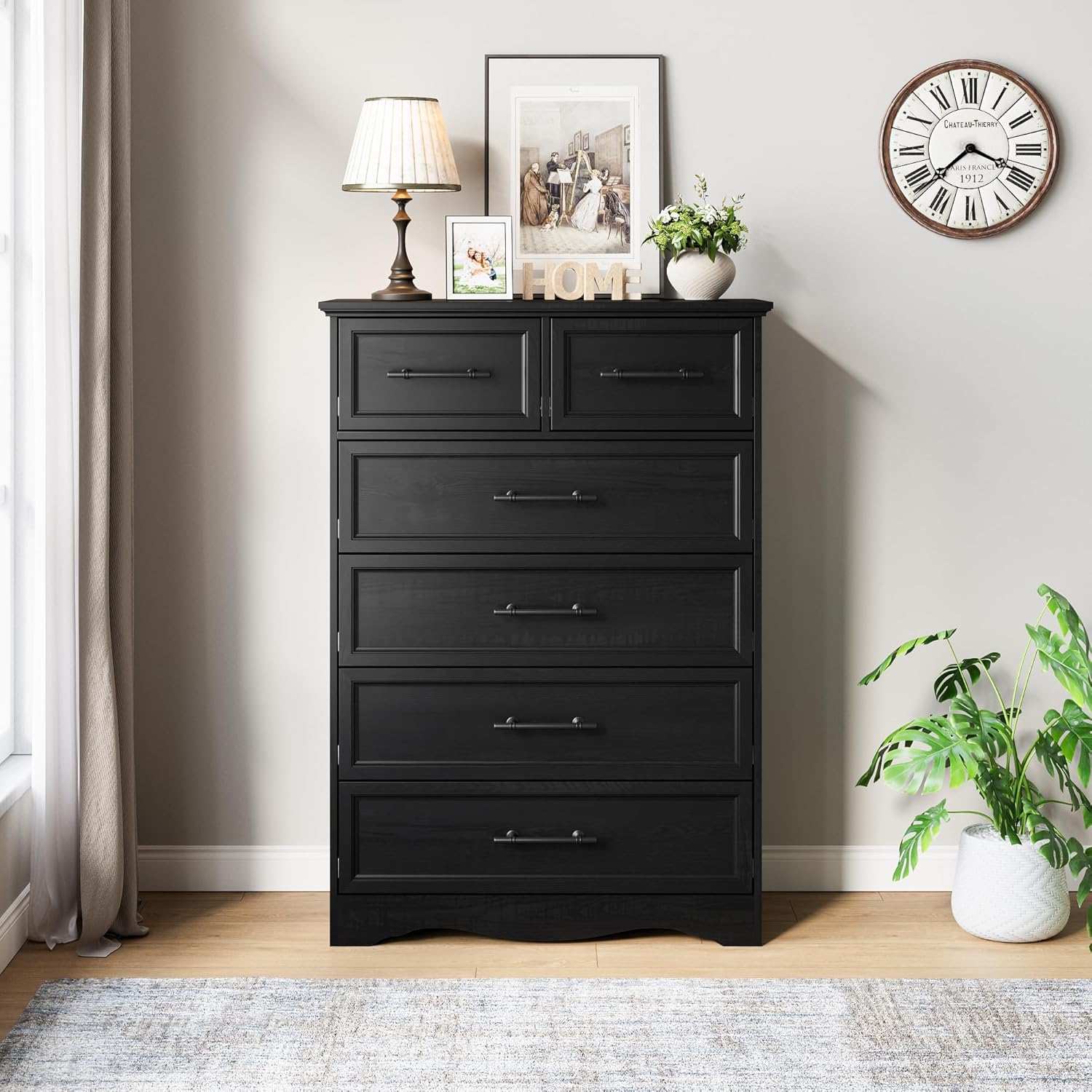 Black Farmhouse Dresser for Bedroom, Modern 6 Chest of Drawers, 44" Tall Chest of Drawers w/Brushed Metal Handle, Wood Closet Organizers and Storage Cabinet for Bedroom, Living Room, Hallway