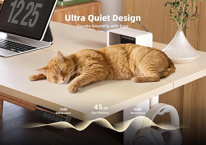 - Height Adjustable & Quiet: The adjustable desk is equipped with a reliable motor that smoothly adjusts the height from 28.3" to 46.5". The motor operates quietly with noise levels under 50 dB, ensuring a peaceful and stable adjustment process, making it ideal for quiet workspaces.