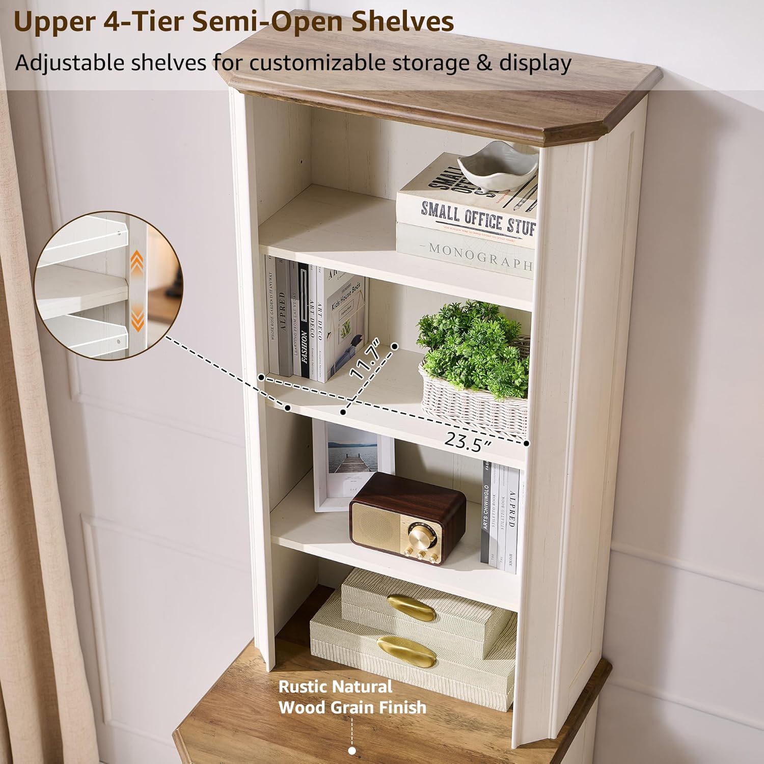 - 4 Adjustable Open Shelves & Spacious Display Surface: This wooden bookshelf with storage features four adjustable semi-open shelves, each with three height settings (up or down 2.5"), allowing you to customize shelf spacing between 7.2"-14.7" to fit books, trophies, decorative items, and frequently accessed items. The 23.5-inch wide tabletop expands your display area while bringing a touch of warmth and farmhouse style to your space