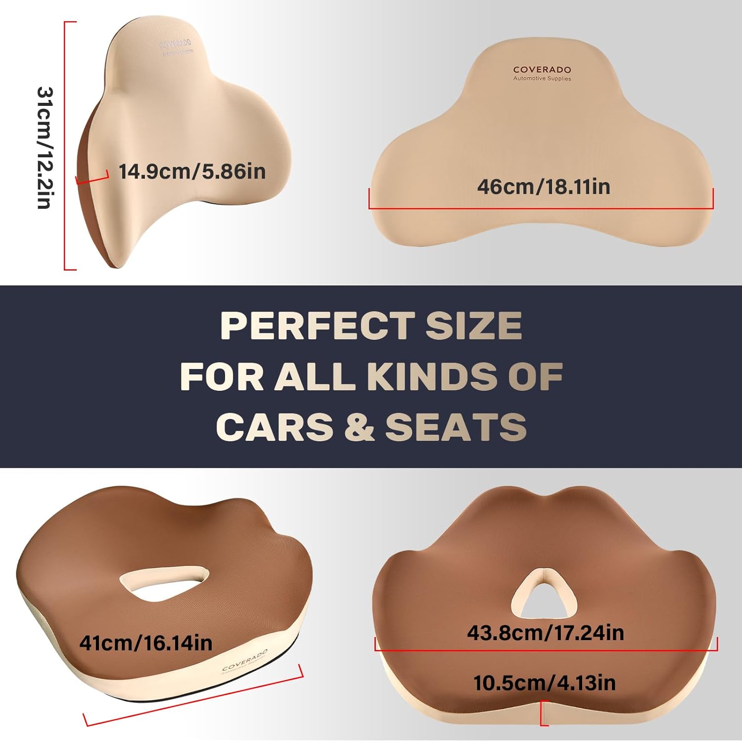 Coverado Seat Cushion and Lumbar Support Pillow for Car Office Chair, Ergonomic Memory Foam Desk Chair Cushion Back Support Pillow, Sciatica & Back & Tailbone Pain Relief Cushion-Beige