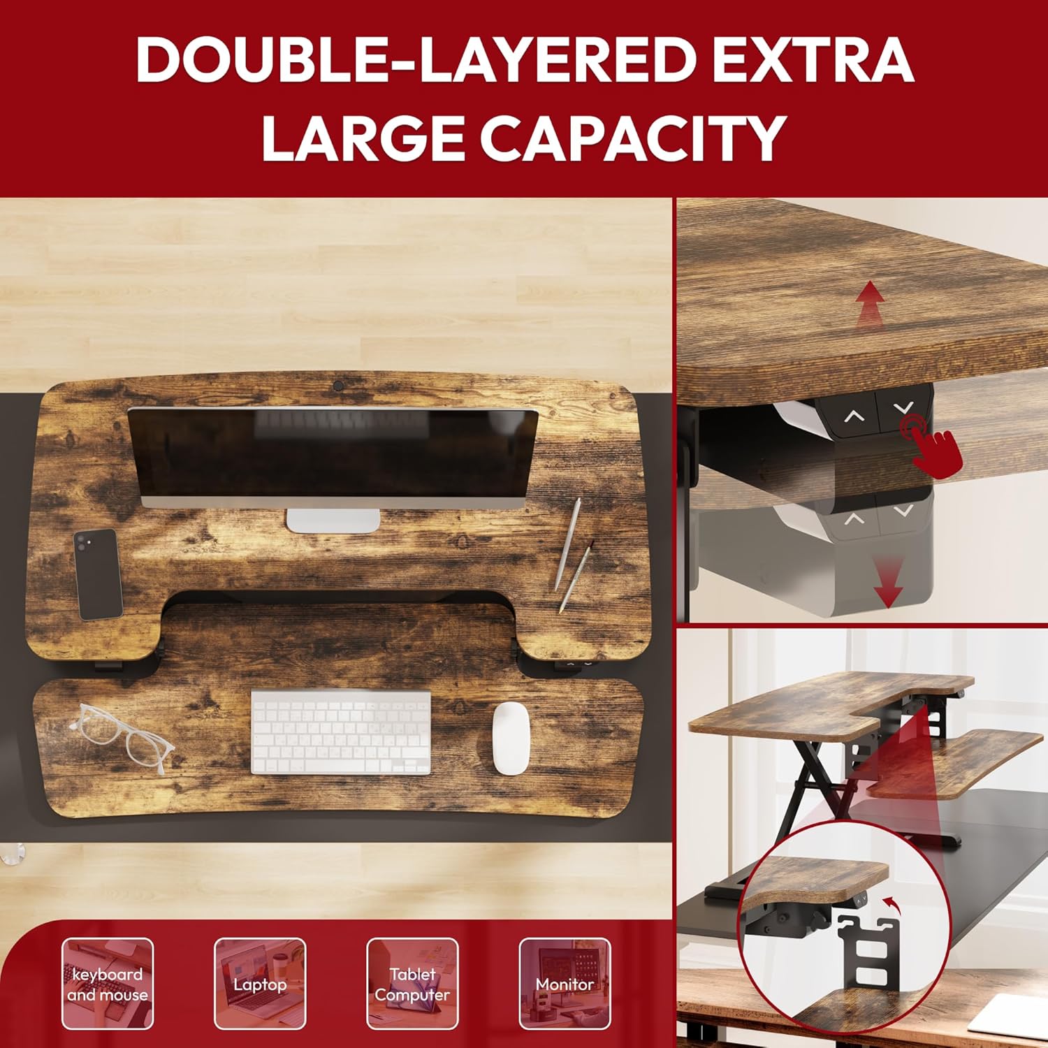 SANODESK Standing Desk Converter with Electric Motor 35" Height Adjustable Desk Riser for Office Home,Monitor and Laptop Workstation with Large Keyboard Tray,Rustic Color
