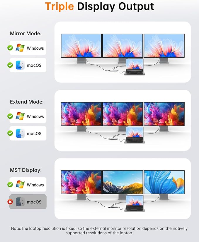 - ๐๐ซ๐ข๐ฉ๐ฅ๐ ๐๐ข๐ฌ๐ฉ๐ฅ๐๐ฒ ๐๐จ๐๐ค๐ข๐ง๐ ๐๐ญ๐๐ญ๐ข๐จ๐ง - ONLY Windows supports Extend Mode with up to three displays, while macOS only Mirror Mode. This docking station features dual HDMI and one VGA port. With two monitors, it outputs 4K@30Hz + 1080P; with three monitors, all displays will output at 1080P@60Hz. HDMI 1 supports up to 4K@60Hz when used alone. All of the above modes require a DP1.4 laptop and monitor.