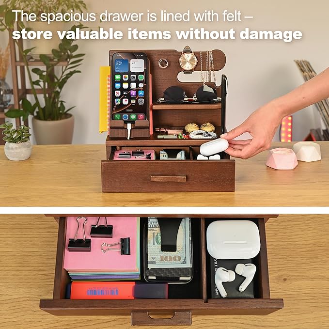 TESLYAR Wood Phone Docking Station with Drawer - Nightstand Organizer - Desk Organizer for Husband - Birthday Gifts for Men, Dad, Anniversary Idea, Key Holder Stand Watch & Accessories (Antique Brown)