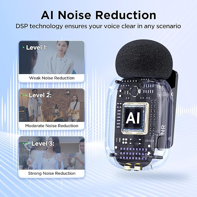 - 3 Levels Smart Noise Cancellation: NO NEED APP, just click the transmitter’s power button to active noise reduction, default level 3. Click the NR button on the receiver to cycle through levels. 3 levels to meet the needs of noise reduction in different scenarios, such as quiet indoor, noisy crowd, live broadcast, etc