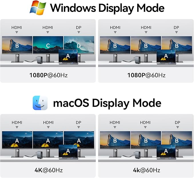 - Docking Station Triple/Dual Monitors: This dock station extends your laptop's display to dual monitors, three monitors through 2 HDMI ports and 1 DP port. ★ In Windows system, while extending to 2 monitors support 4K@30Hz, 3 monitors support 1080P@60Hz. ★ Note: MacOS system laptops do not support MST mode, only support SST mode, all monitors will mirror the desktop interface A-AAA or A-BBB mode
