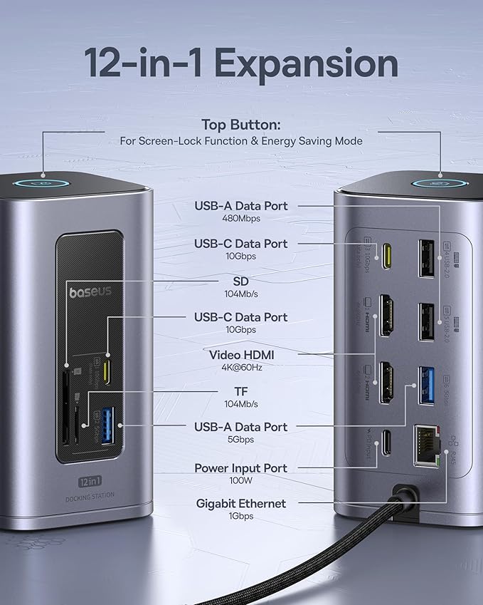 Baseus Docking Station Dual Monitor, Nomos Win Air(12 in 1) Laptop Dock, 2*4K HDMI, 10Gbps USB Ports, 1Gbps Ethernet, PD 100W(No Power Adapter), USB C Docking Station for Dell/HP/Lenovo/Asus/Acer/Mac