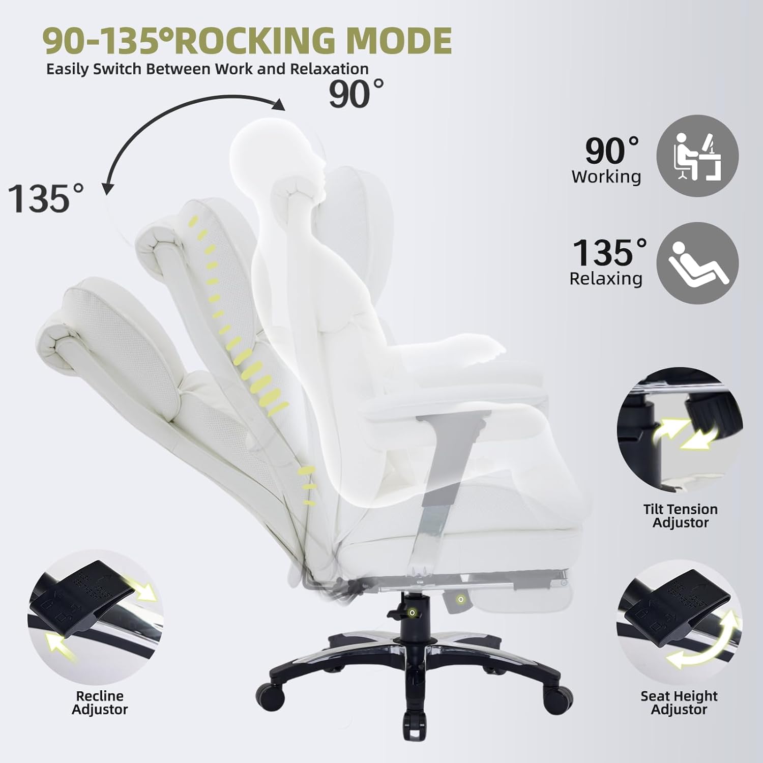 - Versatile White Office Chair— Whether used as a desk chair, gaming chair, or conference chair, this reclining office chair adapts easily to different settings. It features a 90°–135° reclining backrest, adjustable seat height, and a 360° swivel base for personalized comfort and flexible movement.