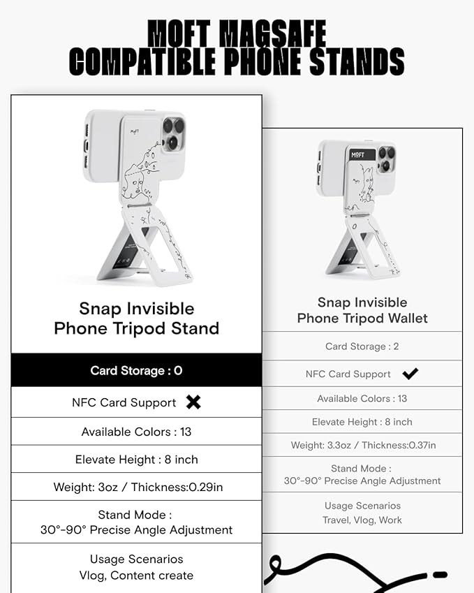 - Universal Compatibility: MOFT Phone Tripod fits iPhone 16/15/14/13/12 series and MagSafe cases. For other devices (such as Samsung) and non-magnetic cases, the phone stand can be attached using the included magnetic ring. Please check the product dimensions (3.8in X 2.5in X 0.27in) to ensure it fits the back of your phone without obstructing the camera. The slim design ensures your phone’s lenses stay unobstructed-perfect for Instagram-worthy shots at cafes, parks, or business events.