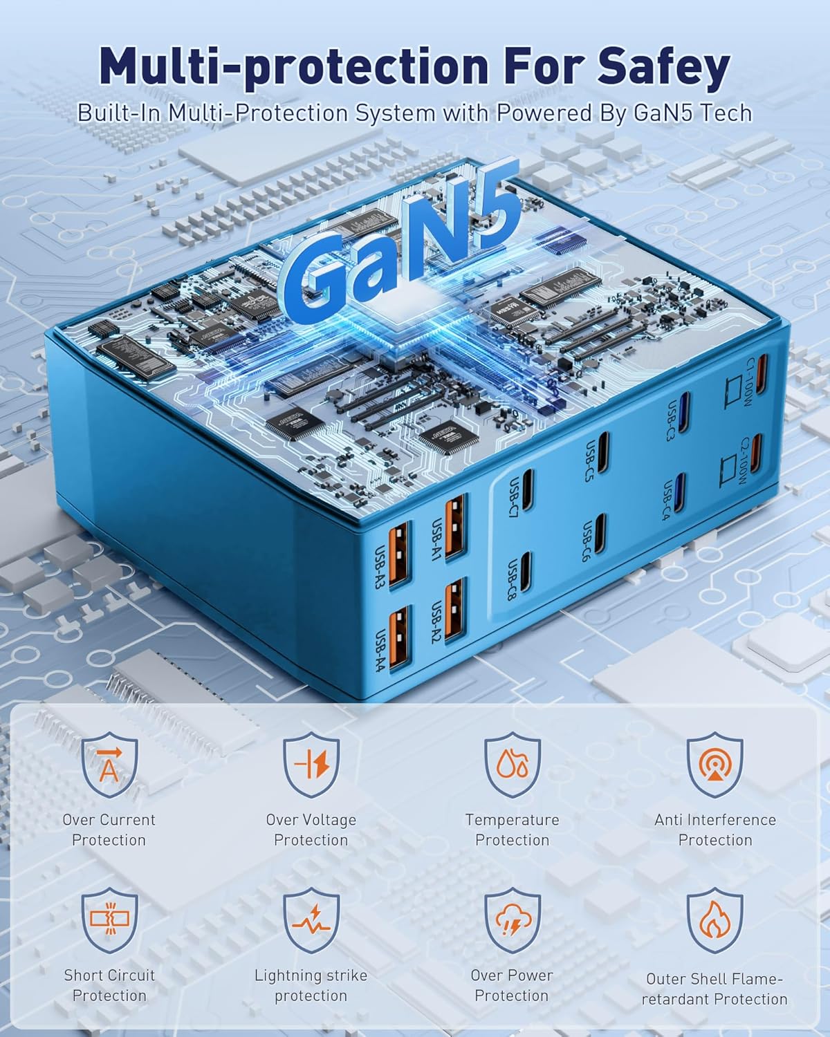 - 【12-in-1 USB C Charging Station】This 600W USB C Charger Block comes with 8 USB C ports and 4 USB A ports to charge multiple devices, simplify your charging setup, and let you experience the convenience of ultra-fast and ultra-high output charging. With its smart charging technology, it can automatically detect and provide the best power output for each connected device, ensuring fast and efficient charging.