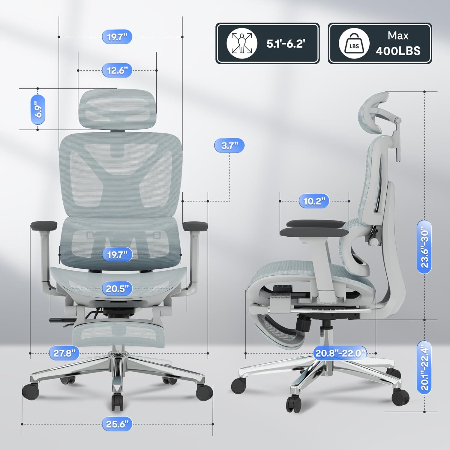 - Enhanced Ergonomics: Dynamic lumbar support, 5-level adjustable back, a 3D adjustable headrest, nap footrest and tilt provide superior back and neck support for long hours.