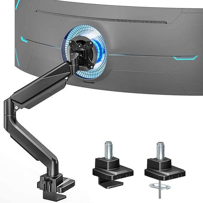 ARES WING Ultrawide Single Monitor Arm, Heavy Duty Monitor Mount for 13"-45" Curved Screens, Adjustable Stand for Desk with C-clamp & Grommet Base up to 40 LBS, Black