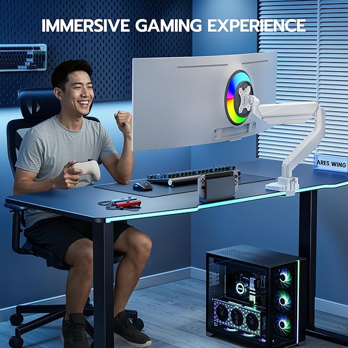 ARES WING Ultrawide Single Monitor Arm, Heavy Duty Monitor Mount for 13"-45" Curved Screens, Adjustable Stand for Desk with C-clamp & Grommet Base up to 40 LBS, White