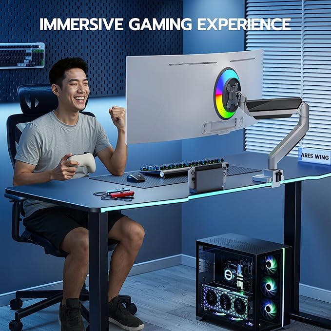ARES WING Ultrawide Single Monitor Arm, Heavy Duty Monitor Mount for 13"-45" Curved Screens, Adjustable Stand for Desk with C-clamp & Grommet Base up to 40 LBS, Gray