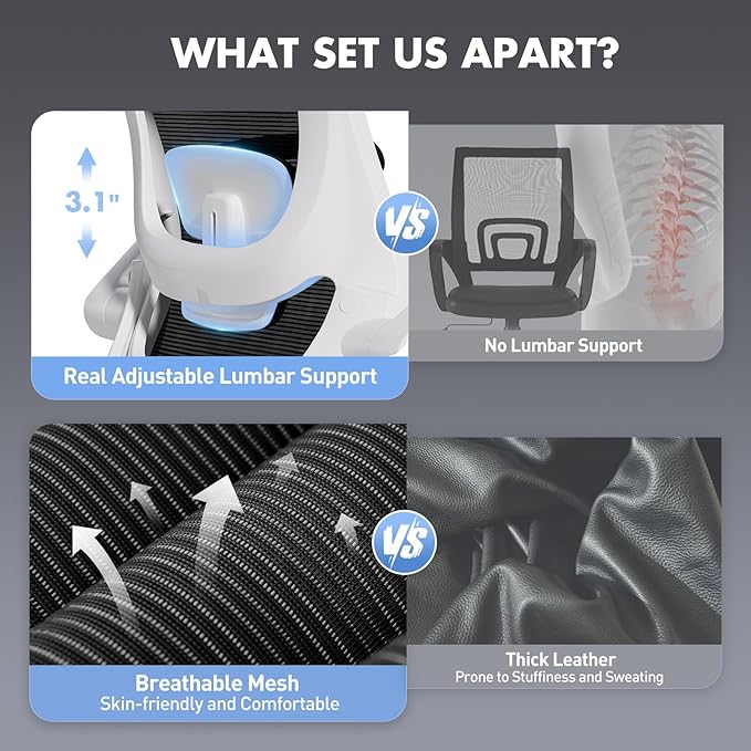 - FULLY ADJUSTABLE LUMBAR SUPPORT FOR BACK PAIN RELIEF:Say goodbye to lower back pain with our ergonomic chair that offers fully adjustable lumbar support. The curved backrest aligns your spine, reducing strain and ensuring you sit comfortably for hours. You can easily adjust the lumbar height to tailor the support to your individual needs, providing relief from chronic back pain. Perfect for home office chairs and ergonomic desk chairs, this feature ensures you maintain healthy posture while boosting your comfort.