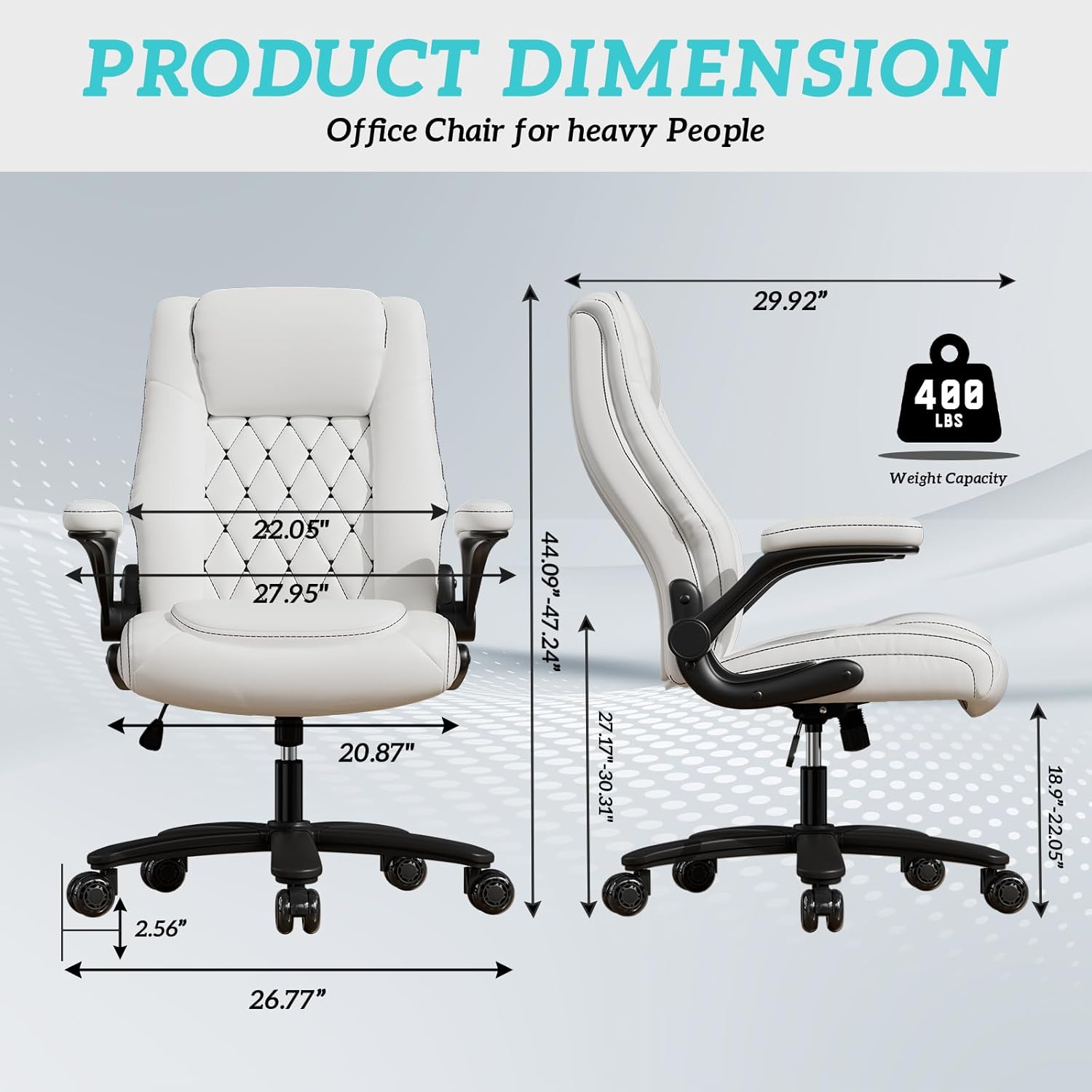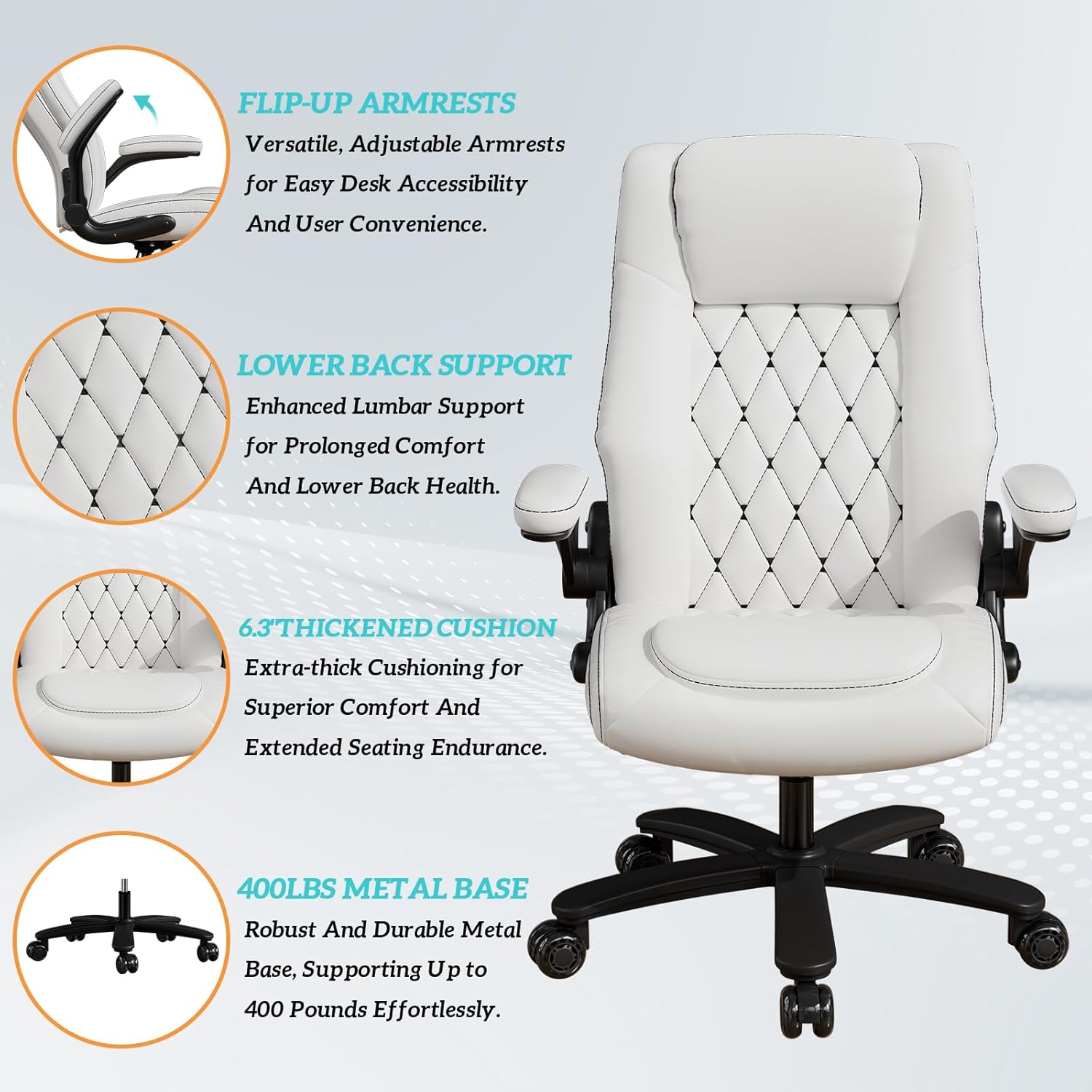 GYI O205P High Back Executive Office Chair, Big and Tall Office Chair 400LBS with Rubber Wheels,Ergonomic Adjustable Computer Desk Chairs with Padded Flip-up Armrests,Lumbar Support (White)