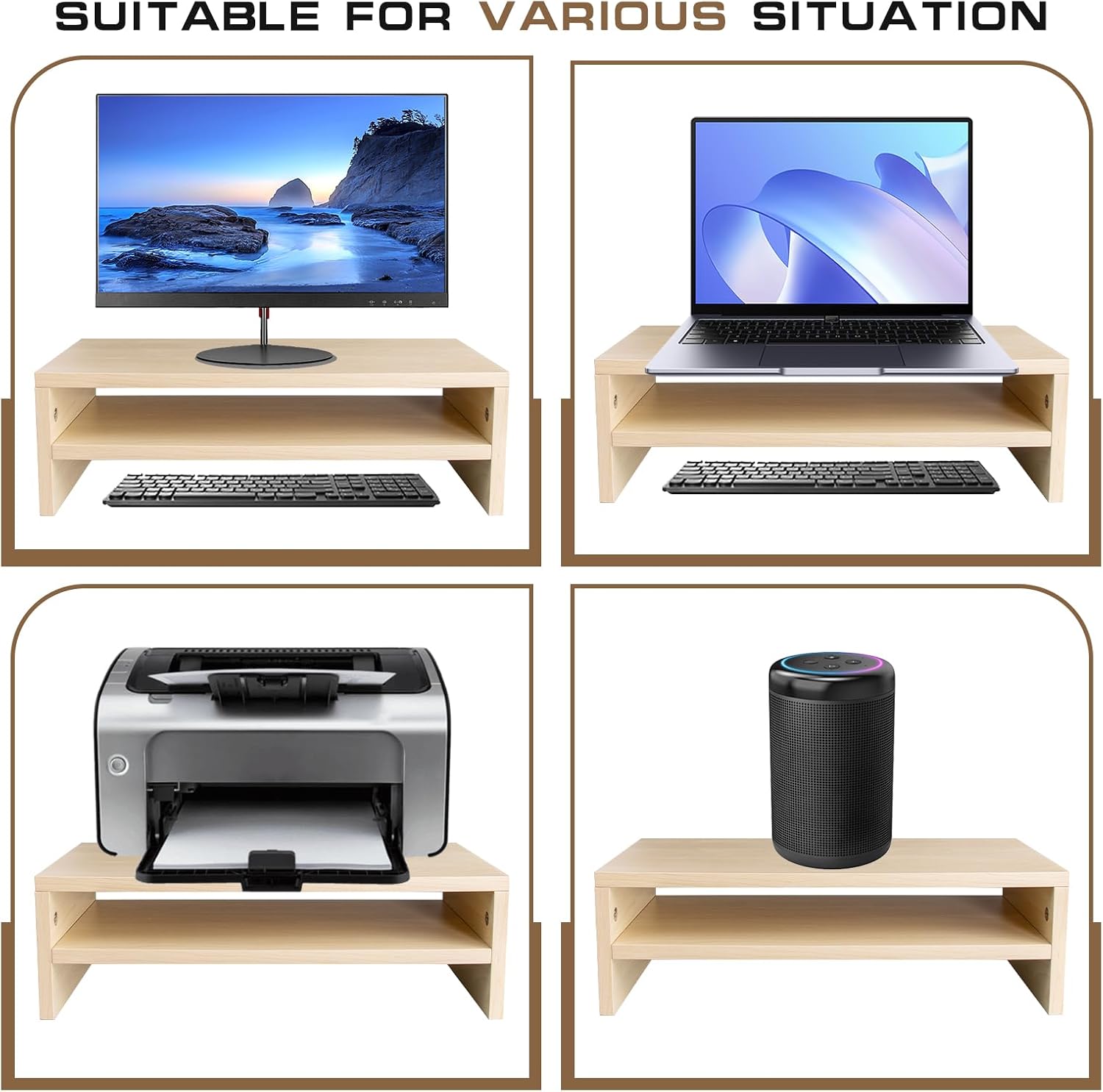 - Sturdy and Reliable Construction:Engineered to support up to 80 lbs, this stand riser provides exceptional stability for your office essentials. The reinforced frame and premium materials ensure long-lasting durability. The wooden monitor riser features soft rubber feet that provide complete stability for your display while protecting your desktop from scratches.