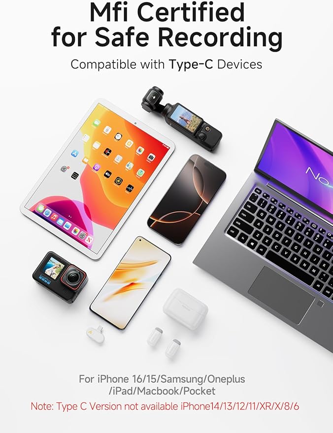 - Essential for Content Creation: The T1 mini lav mic is includes MFI certified USB-C receiver, Widely compatible with iPhone16 15, Android phones, tablets, action cameras, Windows and Mac PC. Perfect for vlogging, video recording, streaming, meetings, and interviews—capture every moment with precision
